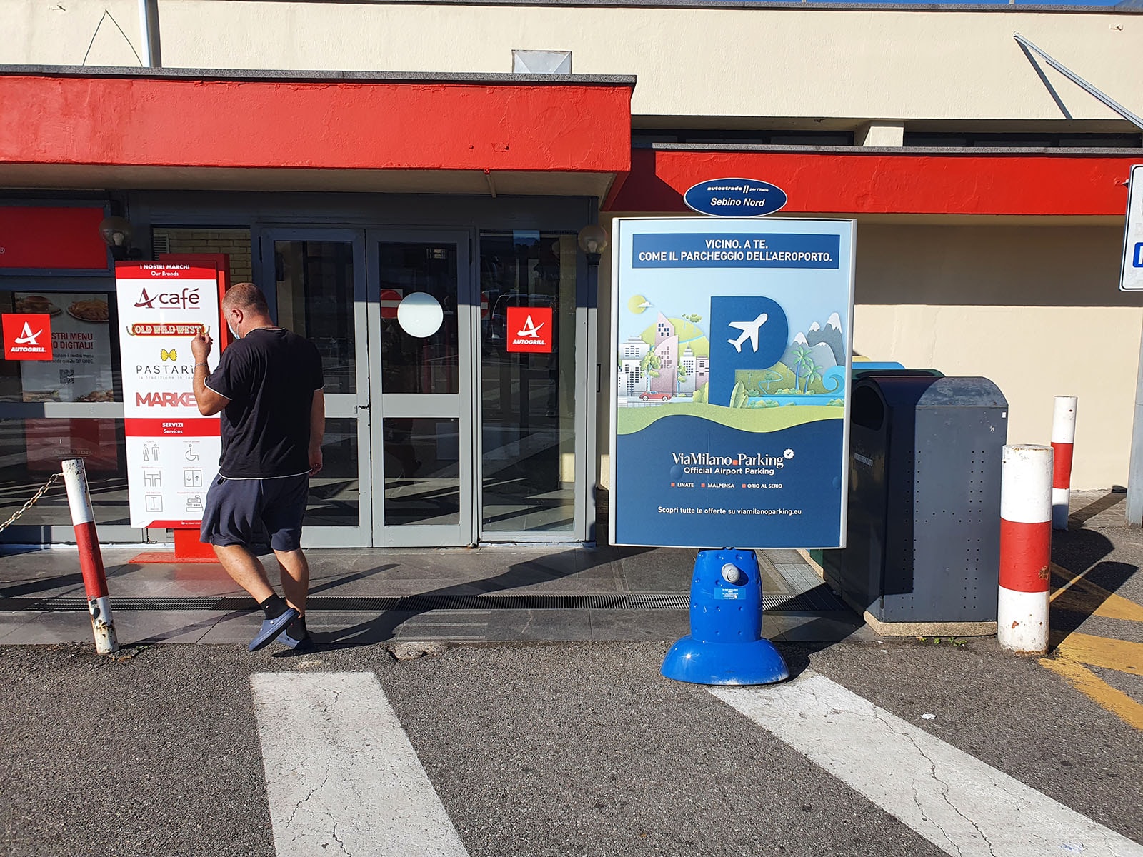 Double-sided, slimline, high-impact pedestrian panels; located close to restaurant entrances and along footpaths to enhance "face-to-face" contact with people moving from the parking area to the restaurant and vice versa.
