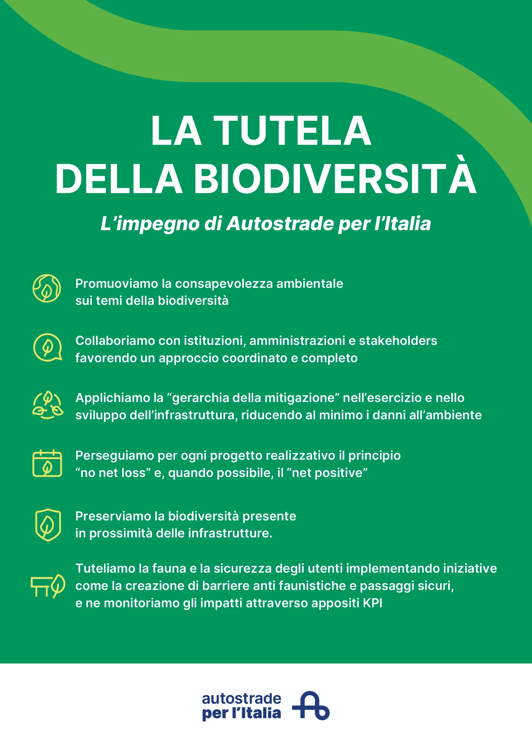 Il Gruppo Autostrade per l’Italia ha intrapreso un percorso di trasformazione, in linea con gli obiettivi di sviluppo sostenibile dell’Agenda 2030, che integra la sostenibilità nel modello di Business e la identifica come elemento distintivo della propria Mission.