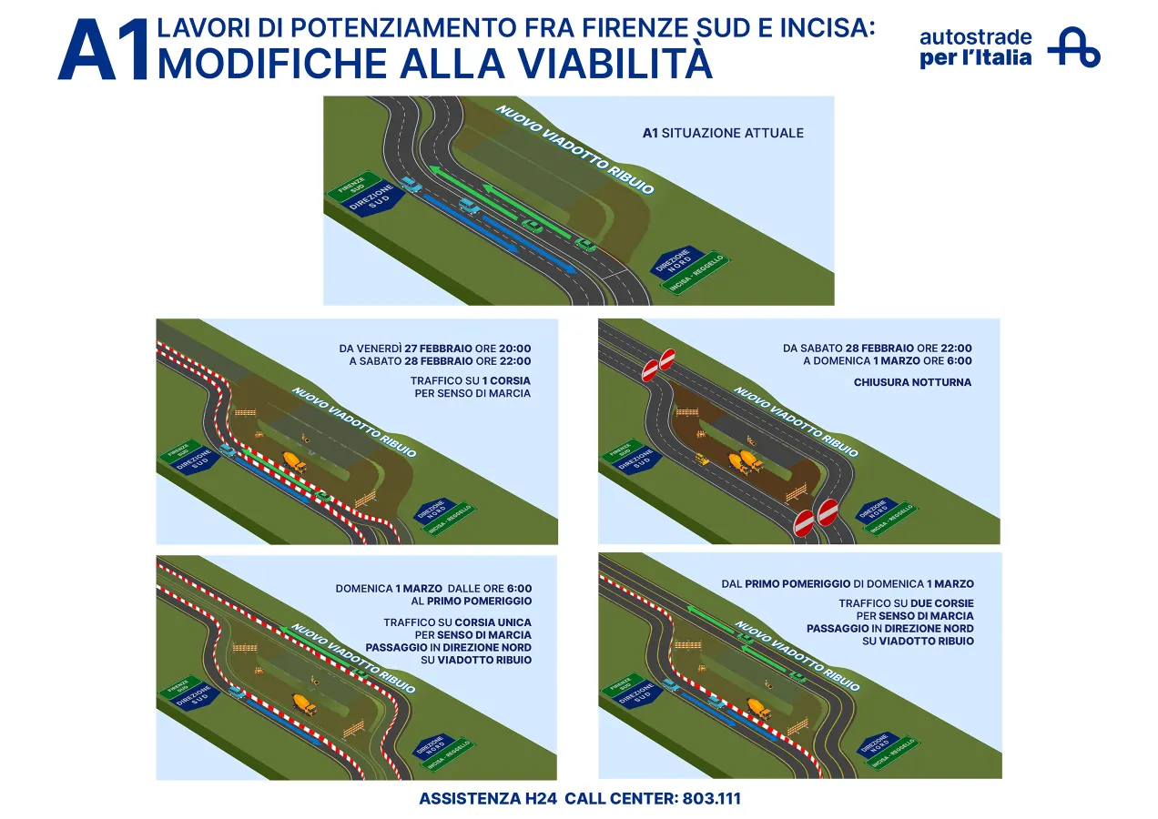 La chiusura totale del tratto Firenze Sud-Incisa sarà limitata, in entrambi i casi, alle sole notti tra sabato e domenica (22:00-6:00). Durante il giorno, invece, la circolazione sarà sempre garantita con una corsia per senso di marcia.