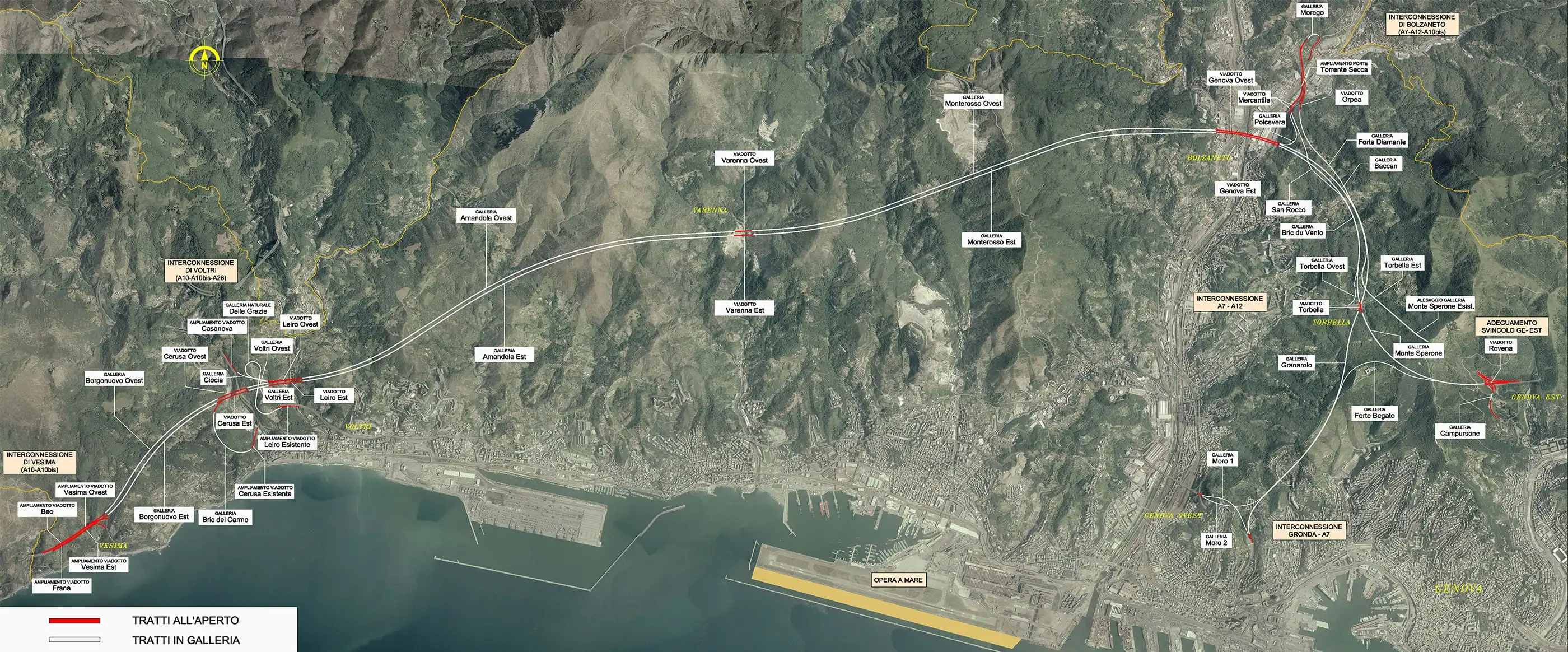 La Gronda di Genova è un nuovo tratto autostradale a due corsie per senso di marcia che rappresenta il raddoppio dell’esistente A10 nel tratto di attraversamento del Comune di Genova (dalla Val Polcevera fino all’abitato di Vesima). La nuova infrastruttura comprende 65 km di nuovi tracciati autostradali e si allaccia agli svincoli che delimitano l’area cittadina (Genova Est, Genova Ovest, Bolzaneto), si connette con la direttrice dell’A26 a Voltri e si ricongiunge con l’A10 in località Vesima. Data la complessità dal punto di vista orografico del territorio attraversato, Il nuovo sistema viario si sviluppa quasi interamente in sotterraneo e prevede 23 gallerie, per un totale di circa 50 chilometri, circa il 81% dell’intero tracciato.